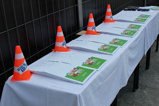 Voller Erwartung trafen sich Veranstalter und Helfer am Zeugnistag am Veranstaltungsort für die letzten Vorbereitungen. Herr Bär installierte die sorgfältig abgestimmte Musikanlage. Für jedes Fahrzeug wurde ein Verkehrsleitkegel mit dem Veranstaltungstitel zur Orientierung aufgestellt. Plakate und Straßenmarkierungen in Form von Klassenraumstühlen zeigten den Teilnehmern an, wo sie Aufstellung nehmen sollten, Gäste und Lehrer trafen ein, Presse- und Fernsehvertreten stellten ihre Fragen.